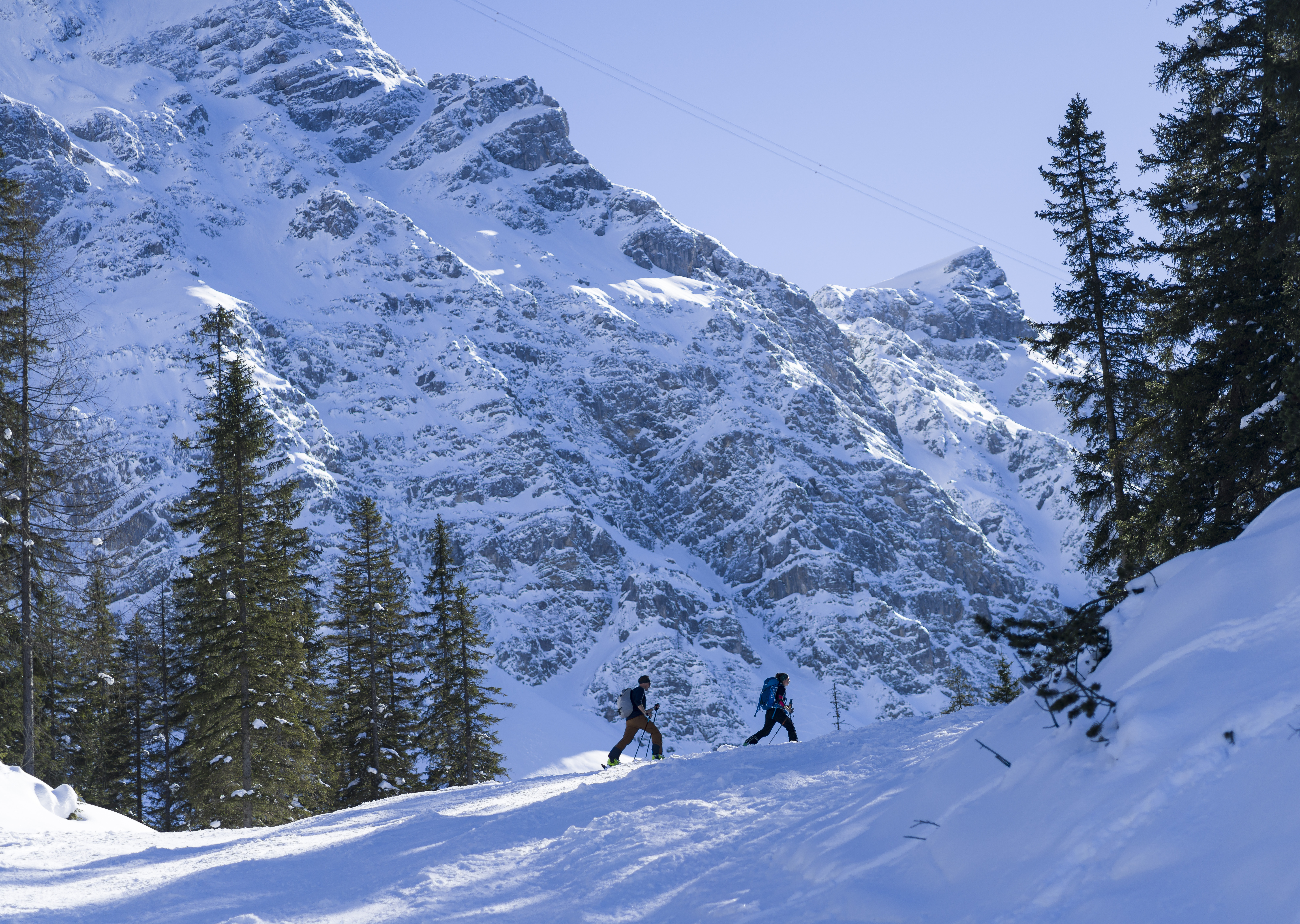 Nach den ersten flacheren Schritten durch den Wald stellt sich langsam Vertrauen auf dem Ski ein. Gerade rechtzeitig, bevor der Weg steiler wird und die Piste hinaufführt und schließlich den Blick auf den Eibsee freigibt. Ein Latschenfeld markiert nach zwei Stunden das Ziel der Tour, hinter dem sich die mächtige Felskulisse der Zugspitze erhebt.